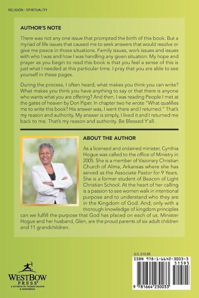 There was not any one issue that prompted the birth of this book. But a myriad of life issues that caused me to seek answers that would resolve or give me peace in those situations. Family issues, work issues and issues with who I was and how I was handling any given situation. My hope and prayer as you begin to read this book is that you feel a sense of this is just what I needed at this particular time. I pray that you are able to see yourself in these pages. During the process, I often heard, what makes you think you can write? What makes you think you have anything to say or that there is anyone who wants what you are offering? And then, I was reading People I met at the gates of heaven by Don Piper. In chapter two he wrote "What qualifies me to write this book? His answer was, I went there and I returned." That's my reason and authority. My answer is simply, I lived it and I returned me back to me. That's my reason and authority. Be Blessed Y'all.