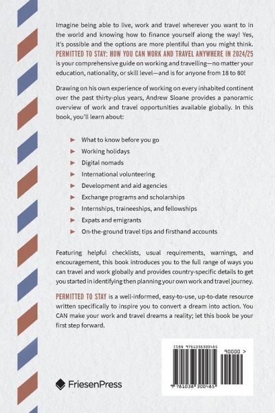 Imagine being able to live, work and travel wherever you want to in the world and knowing how to finance yourself along the way! Yes, it's possible and the options are more plentiful than you might think. Permitted to Stay: How YOU Can Work and Travel Anywhere in 2024/25 is your comprehensive guide on working and travelling-no matter your, education, nationality, or skill level and is for anyone from 18 to 80! Drawing on his own experience of working on every inhabited continent over the past thirty plus years, Andrew Sloane provides a panoramic overview of work and travel opportunities available globally. In this book, you'll learn about: ¿ What to know before you go ¿ Working holidays ¿ Digital nomads ¿ International volunteering ¿ Development and aid agencies ¿ Exchange programs and scholarships ¿ Internships, traineeships, and fellowships ¿ Expats and emigrants ¿ On-the-ground travel tips and firsthand accounts Featuring helpful checklists, usual requirements, warnings, and encouragement, this book introduces you to the full range of ways you can travel and work globally and provides country-specific details to get you started in identifying then planning your own work and travel journey. Permitted to Stay is a well-informed, easy-to-use, up-to-date resource written specifically to inspire you to convert a dream into action. You CAN make your work and travel dreams a reality; let this book be your first step forward.