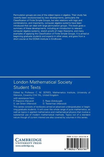 Permutation groups are one of the oldest topics in algebra. However, their study has recently been revolutionised by new developments, particularly the classification of finite simple groups, but also relations with logic and combinatorics, and importantly, computer algebra systems have been introduced that can deal with large permutation groups. This book gives a summary of these developments, including an introduction to relevant computer algebra systems, sketch proofs of major theorems, and many examples of applying the classification of finite simple groups. It is aimed at beginning graduate students and experts in other areas, and grew from a short course at the EIDMA institute in Eindhoven.