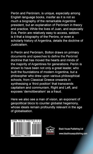 Perón and Perónism, is unique, especially among English language books, insofar as it is not so much a biography of the remarkable Argentine president, but an explanation of Perónism in theory and practice. While the lives of Juan, and especially Eva, Perón are relatively easy to access, seldom is it that a biography of the Peróns, or even a scholarly history of Argentina, details the doctrine of Justicialism. In Perón and Perónism, Bolton draws on primary documents and speeches to define the Perónist doctrine that has moved the hearts and minds of the majority of Argentines for generations. Perón is shown to have been not only a great leader, who built the foundations of modern Argentina, but a philosopher who drew upon various philosophical schools, from Classical Greece onwards in synthesising a 'third position' that transcends capitalism and communism, Right and Left, and exposes 'demoliberalism' as a fraud. Here we also see a man of vision, an exponent of geopolitical blocs to counter globalist hegemony, whose ideals remain profoundly relevant in the age of globalisation.