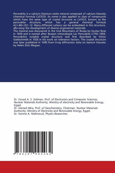 Perovskite is a calcium titanium oxide mineral composed of calcium titanate (chemical formula CaTiO3). Its name is also applied to class of compounds which have the same type of crystal structure as CaTiO3, known as the perovskite structure, which has a general chemical formula A2+B4+(X2-)3. Many different cations can be embedded in this structure, allo-wing the development of diverse engineered materials. The mineral was discovered in the Ural Mountains of Russia by Gustav Rose in 1839 and is named after Russian mineralogist Lev Perovskite (1792-1856. Perovskite's notable crystal structure was first described by Victor Goldschmidt in 1926 in his work on tolerance factors. The crystal structure was later published in 1945 from X-ray diffraction data on barium titanate by Helen Dick Megaw.