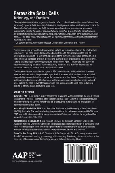 Covers the basics and up-to-date research on perovskite photovoltaicsà â â a fast trending branch of the thin film photovoltaic generation. Starts with the history of development and revolution of PSCs, then delves into electron-transporting and hole-transporting materials and lead-free alternatives. Information on tandem solar cells is also included