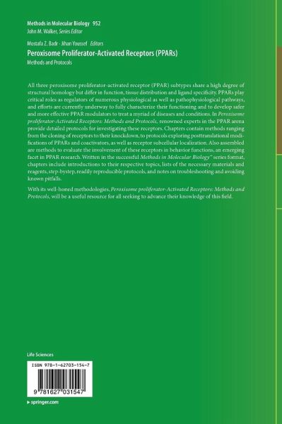 All three peroxisome proliferator-activated receptor (PPAR) subtypes share a high degree of structural homology but differ in function, tissue distribution and ligand specificity. PPARs play critical roles as regulators of numerous physiological as well as pathophysiological pathways, and efforts are currently underway to fully characterize their functioning and to develop safer and more effective PPAR modulators to treat a myriad of diseases and conditions. In Peroxisome proliferator-Activated Receptors: Methods and Protocols, renowned experts in the PPAR arena provide detailed protocols for investigating these receptors. Chapters contain methods ranging from the cloning of receptors to their knockdown, to protocols exploring posttranslational modifications of PPARs and coactivators, as well as receptor subcellular localization. Also assembled are methods to evaluate the involvement of these receptors in behavior functions, an emerging facet in PPAR research. Written in the successful Methods in Molecular Biology(TM) series format, chapters include introductions to their respective topics, lists of the necessary materials and reagents, step-by-step, readily reproducible protocols, and notes on troubleshooting and avoiding known pitfalls.
