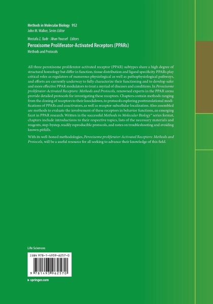 All three peroxisome proliferator-activated receptor (PPAR) subtypes share a high degree of structural homology but differ in function, tissue distribution and ligand specificity. PPARs play critical roles as regulators of numerous physiological as well as pathophysiological pathways, and efforts are currently underway to fully characterize their functioning and to develop safer and more effective PPAR modulators to treat a myriad of diseases and conditions. In Peroxisome proliferator-Activated Receptors: Methods and Protocols, renowned experts in the PPAR arena provide detailed protocols for investigating these receptors. Chapters contain methods ranging from the cloning of receptors to their knockdown, to protocols exploring posttranslational modifications of PPARs and coactivators, as well as receptor subcellular localization. Also assembled are methods to evaluate the involvement of these receptors in behavior functions, an emerging facet in PPAR research. Written in the successful Methods in Molecular Biology(TM) series format, chapters include introductions to their respective topics, lists of the necessary materials and reagents, step-by-step, readily reproducible protocols, and notes on troubleshooting and avoiding known pitfalls.