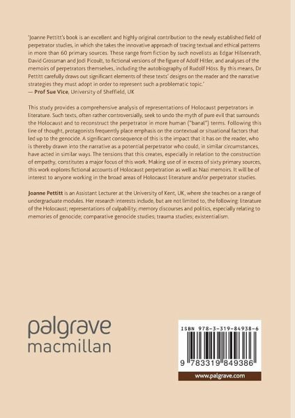 This study provides a comprehensive analysis of representations of Holocaust perpetrators in literature. Such texts, often rather controversially, seek to undo the myth of pure evil that surrounds the Holocaust and to reconstruct the perpetrator in more human ("banal") terms. Following this line of thought, protagonists frequently place emphasis on the contextual or situational factors that led up to the genocide. A significant consequence of this is the impact that it has on the reader, who is thereby drawn into the narrative as a potential perpetrator who could, in similar circumstances, have acted in similar ways. The tensions that this creates, especially in relation to the construction of empathy, constitutes a major focus of this work. Making use of in excess of sixty primary sources, this work explores fictional accounts of Holocaust perpetration as well as Nazi memoirs. It will be of interest to anyone working in the broad areas of Holocaust literature and/or perpetrator studies.