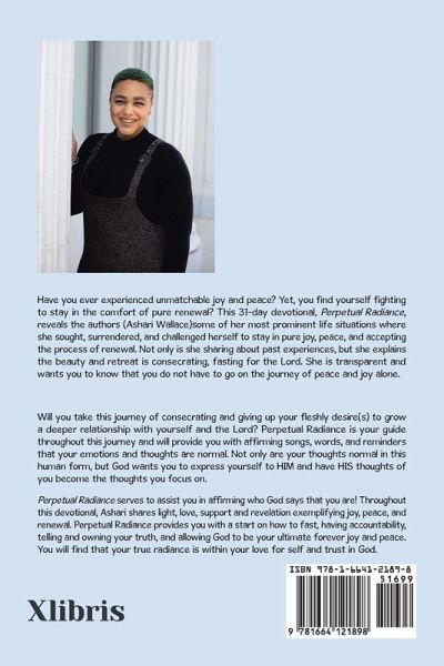 Have you ever experienced unmatchable joy and peace? Yet, you find yourself fighting to stay in the comfort of pure renewal? This 31-day devotional, Perpetual Radiance, reveals the authors (Ashari Wallace)some of her most prominent life situations where she sought, surrendered, and challenged herself to stay in pure joy, peace, and accepting the process of renewal. Not only is she sharing about past experiences, but she explains the beauty and retreat is consecrating, fasting for the Lord. She is transparent and wants you to know that you do not have to go on the journey of peace and joy alone. Will you take this journey of consecrating and giving up your fleshly desire(s) to grow a deeper relationship with yourself and the Lord? Perpetual Radiance is your guide throughout this journey and will provide you with affirming songs, words, and reminders that your emotions and thoughts are normal. Not only are your thoughts normal in this human form, but God wants you to express yourself to HIM and have HIS thoughts of you become the thoughts you focus on. Perpetual Radiance serves to assist you in affirming who God says that you are! Throughout this devotional, Ashari shares light, love, support and revelation exemplifying joy, peace, and renewal. Perpetual Radiance provides you with a start on how to fast, having accountability, telling and owning your truth, and allowing God to be your ultimate forever joy and peace. You will find that your true radiance is within your love for self and trust in God.