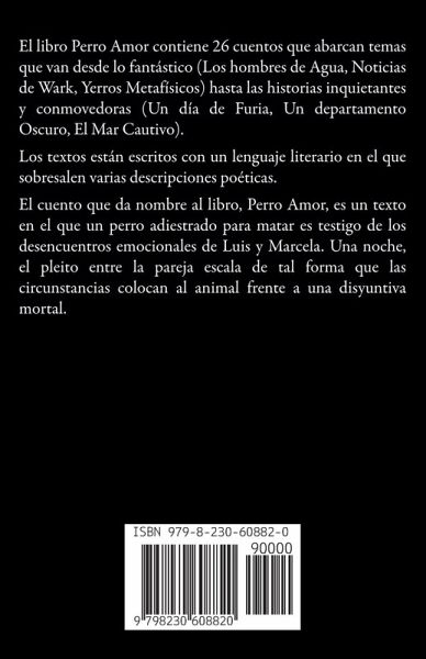 El libro Perro Amor contiene 26 cuentos que abarcan temas que van desde lo fantástico (Los hombres de Agua, Noticias de Wark, Yerros Metafísicos) hasta las historias inquietantes y conmovedoras (Un día de Furia, Un departamento Oscuro, El Mar Cautivo). Los textos están escritos con un lenguaje literario en el que sobresalen varias descripciones poéticas. El cuento que da nombre al libro, Perro Amor, es un texto en el que un perro adiestrado para matar es testigo de los desencuentros emocionales de Luis y Marcela. Una noche, el pleito entre la pareja escala de tal forma que las circunstancias colocan al animal frente a una disyuntiva mortal.