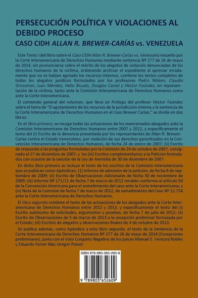 Este Tomo I del libro sobre el Caso CIDH Allan R. Brewer-Carías vs. Venezuela resuelto por la Corte Interamericana de Derechos Humanos mediante sentencia No. 277 de 26 de mayo de 2014, sin pronunciarse sobre el mérito de los alegatos de violación denunciadas de los derechos humanos de la víctima, ordenando archivar el expediente al apreciar erradamente que no se habían agotado los recursos internos, contiene los textos completos de todos los alegatos jurídicos formulados por los profesores Pedro Nikken, Claudio Grossman, Juan Méndez, Helio Bicudo, Douglas Cassel y Héctor Faúndez, en representación de la víctima, tanto ante la Comisión Interamericana de Derechos Humanos como ante la Corte Interamericana. El contenido general del volumen, que lleva un Prólogo del profesor Héctor Faúndez sobre el tema de "El agotamiento de los recursos de la jurisdicción interna y la sentencia de la Corte Interamericana de Derechos Humanos en el Caso Brewer Carías," se divide en dos libros: En el libro primero, se recoge todas las actuaciones de los mencionados abogados ante la Comisión Interamericana de Derechos Humanos entre 2007 y 2012, y específicamente el texto del (i) Escrito de la denuncia presentada por los representantes de Allan R. Brewer-Carías contra el Estado Venezolano, por violación de sus derechos garantizados en la Convención Interamericana de Derechos Humanos, de fecha 24 de enero de 2007; (ii) Escrito de respuesta a las preguntas formuladas por la Comisión de 24 de octubre de 2007, consignado el 27 de diciembre de 2007; y los (iii) Escritos complementarios a la Petición formulados con ocasión de la sanción de la Ley de Amnistía de 30 de diciembre de 2007. En dicho libro primero se incluye el texto de los escritos de la Comisión Interamericana que se publican como Apéndices: (1) Informe de admisión de la petición, de fecha 8 de septiembre de 2009; (ii) Escrito de Observaciones Adicionales de fecha 30 de noviembre de 2009; (iii) Informe nº 171/11 de fecha 7 de marzo de 2012 rendido conforme al artículo 50 de la Convención Americana para el sometimiento del caso ante la Corte Interamericana; y (iv) Nota de la Comisión de fecha 7 de marzo de 2012, de sometimiento del Caso nº 12.724 ante la Corte Interamericana de Derechos Humanos. El libro segundo contiene el texto de las actuaciones de los abogados ante la Corte Interamericana de Derechos Humanos entre 2012 y 2013, y específicamente el texto del (i) Escrito autónomo de solicitudes, argumentos y pruebas, de fecha 7 de julio de 2012; (ii) Escrito de Observaciones de 5 de marzo de 2013 a la excepción preliminar formulada por el Estado; (iii) Escritos de alegatos y observaciones finales de 4 de octubre de 2013. Se publica además, como Apéndice a este libro segundo, el texto de la Sentencia de la Corte Interamericana de Derechos Humanos nº 277 de 26 de mayo de 2014 (Excepciones preliminares), junto con el Voto Conjunto Negativo de los jueces Manuel E. Ventura Robles y Eduardo Ferrer Mac-Gregor Poisot.