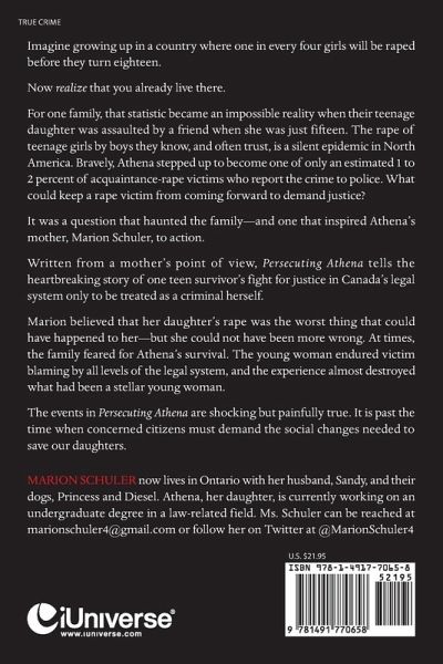 Imagine growing up in a country where one in every four girls will be raped before they turn eighteen. Now realize that you already live there. For one family, that statistic became an impossible reality when their teenage daughter was assaulted by A friend when she was just fifteen. The rape of teenage girls by boys they know, and often trust, is a silent epidemic in North America. Bravely, Athena stepped up to become one of only an estimated 1 to 2 percent of acquaintance-rape victims who report the crime to police. What could keep a rape victim from coming forward to demand justice? It was a question that haunted the family-and one that inspired Athena's mother, Marion Schuler, to action. Written from a mother's point of view, Persecuting Athena tells the heartbreaking story of one teen survivor's fight for justice in Canada's legal system only to be treated as a criminal herself. Marion believed that her daughter's rape was the worst thing that could have happened to her-but she could not have been more wrong. At times, the family feared for Athena's survival. The young woman endured victim blaming by all levels of the legal system, and the experience almost destroyed what had been a stellar young woman. The events in Persecuting Athena are shocking but painfully true. It is past the time when concerned citizens must demand the social changes needed to save our daughters.