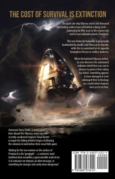 A cutting-edge hard SF trip to the nearest star, Alpha Centauri, and humanity's desperate bid for a new home on the planet Proxima-b. The immense ark-ship Odyssey and its ten thousand hibernating settlers have left behind a dying Earth-journeying for fifty years to the nearest star and its lone habitable planet, Proxima-b. This new home for humanity is perpetually bombarded by deadly solar flares on its dayside, while the icy wasteland on its opposite hemisphere freezes in endless darkness. When the battered Odyssey arrives, its crew discovers the automated radiation shield has failed. Something appears to have damaged or perhaps even sabotaged their technology on a world where humans have yet to set foot. Astronaut Darcy Clarke, a young pilot born aboard the Odyssey, teams up with recently awakened engineer Tanya Baxter to repair the failing shield in hopes of allowing the colonists to land before their vessel falls apart. Waiting for the two explorers on the surface of Proxima-b is the geoglyph-a continent-sized landform that resembles a giant metallic work of art. Is it a massive ore deposit, an alien message, or something far stranger and vastly more dangerous? Or perhaps even sabotage for their technology on a world where humans have yet to set foot?