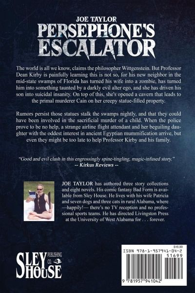 The world is all we know, claims the philosopher Wittgenstein. But Professor Dean Kirby is painfully learning this is not so, for his new neighbor in the mid-state swamps of Florida has turned his wife into a zombie, has turned him into something taunted by a darkly evil alter ego, and she has driven his son into suicidal insanity. On top of this, she's opened a cavern that leads to the primal murderer Cain on her creepy, statue-filled property. Rumors persist those statues stalk the swamps nightly, and that they could have been involved in the sacrificial murder of a child. When the police prove to be no help, a strange airline attendant and her beguiling daughter with the oddest interest in ancient Egyptian mummification arrive, but even they might be too late to help Professor Kirby and his family. Persephone's Escalator is the second book of Joe Taylor's published by Sley House Publishing. Where his last book was a contemporary, comedic, fantasy, this novel is horror, complete with creepy dolls, murderous statues, and a witch tormenting her neighbors. Taylor has published numerous books and is in charge of Livingston Press at the University of Western Georgia. Persephone's Escalator is available in 6x9 Perfect Bound trade paperback and in eBook format.