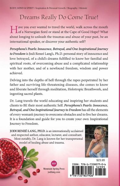 Dreams Really Do Come True! Have you ever wanted to travel the world, walk across the mouth of a Norwegian fiord or stand at the Cape of Good Hope? What about longing to unleash the traumas and abuse of your past, be an international speaker, or discover your authentic self? Persephone's Pearls: Innocence, Betrayal, and One Inspirational Journey to Freedom is Jodi Reneé Lang's, Ph.D. personal story of innocence and love betrayed, of a child's dreams fulfilled to know her familial and spiritual roots, of overcoming abuse and a complicated relationship with her mother, and of a newfound freedom, wisdom and power achieved. Delving into the depths of hell through the rapes perpetrated by her father and surviving life-threatening diseases, she comes to know and liberate herself through meditation, Holotropic Breathwork, and ingesting sacred plants. Dr. Lang travels the world educating and inspiring her students and clients to BE their most authentic Self. Persephone's Pearls: Innocence, Betrayal, and One Inspirational Journey to Freedom has all the elements of every woman's journey to overcome obstacles and to live her dreams. It is a foundation and guide for you to create your own Inspirational Journey to Freedom.