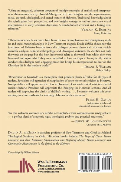 This commentary is the first to fully apply the resources of socio-rhetorical analysis to Hebrews. Insights into the cultural and social world of the audience are combined with analysis of the author's rhetorical strategy and ideology to create a rich, three-dimensional reading that helps unravel key issues in the interpretation of the epistle. David deSilva's reflections on application concluding each section also make his commentary valuable to seminarians and pastors seeking to make Hebrews relevant to today's world.