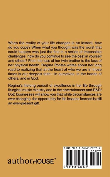 When the reality of your life changes in an instant, how do you cope? When what you thought was the worst that could happen was just the first in a series of impossible challenges, how do you continue to see the best in yourself and others? From the loss of her twin brother to the loss of her physical health, Regina Pontes writes about her long road to realizing that at the heart of who we are in those times is our deepest faithin ourselves, in the hands of others, and in God. Reginas lifelong pursuit of excellence in her life through liturgical music ministry and in the entertainment and R&D/DoD businesses will show you that while circumstances are ever-changing, the opportunity for life lessons learned is still an ever-present gift.