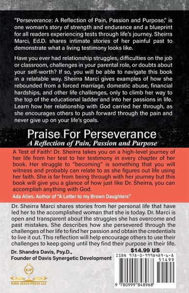 Perseverance: A Reflection of Pain, Passion and Purpose is a story of strength and endurance and a blueprint for readers experiencing tests through life's journey. Marci shares stories of her past to show what a living testimony is.