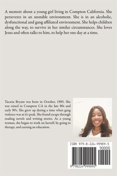 A memoir about a young girl living in Compton California. She perseveres in an unstable environment. She is in an alcoholic, dysfunctional and gang affiliated environment. She helps children along the way, to survive in her similar circumstances. She loves Jesus and often talks to him, to help her one day at a time.