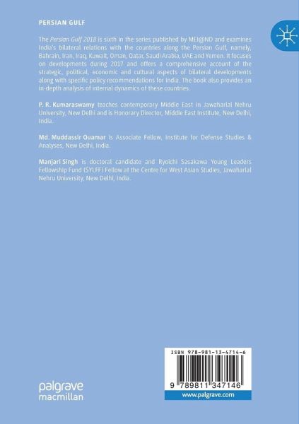 The Persian Gulf 2018 is sixth in the series published by MEI@ND and examines India's bilateral relations with the countries along the Persian Gulf, namely, Bahrain, Iran, Iraq, Kuwait, Oman, Qatar, Saudi Arabia, UAE and Yemen. It focuses on developments during 2017 and offers a comprehensive account of the strategic, political, economic and cultural aspects of bilateral developments along with specific policy recommendations for India.The book also provides an in-depth analysis of internal dynamics of these countries.