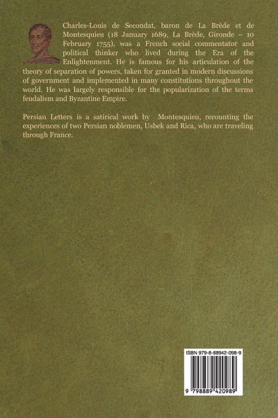 Persian Letters is a satirical work by Charles de Secondat, baron de Montesquieu, recounting the experiences of two Persian noblemen, Usbek and Rica, who are traveling through France. In 1711 Usbek leaves his seraglio in Isfahan to undertake the long journey to France, accompanied by his young friend Rica. He leaves behind five wives (Zachi, Zéphis, Fatmé, Zélis, and Roxane) in the care of a number of black eunuchs, one of whom is the head or first eunuch. During the trip and their long stay in Paris (1712-1720), they comment, in letters exchanged with friends and mullahs, on numerous aspects of Western, Christian society, particularly French politics and mores, ending with a biting satire of the System of John Law. Over time, various disorders surface back in the seraglio, and beginning in 1717 (Letter 139 [147]), the situation there rapidly unravels. Usbek orders his head eunuch to crack down, but his message does not arrive in time and a revolt brings about the death of his wives, including the vengeful suicide of his favorite, Roxane, and, it appears, most of the eunuchs... About the author: Charles-Louis de Secondat, baron de La Brède et de Montesquieu (18 January 1689, La Brède, Gironde - 10 February 1755), was a French social commentator and political thinker who lived during the Era of the Enlightenment. He is famous for his articulation of the theory of separation of powers, taken for granted in modern discussions of government and implemented in many constitutions throughout the world. He was largely responsible for the popularization of the terms feudalism and Byzantine Empire. Persian Letters is a satirical work by Montesquieu, recounting the experiences of two Persian noblemen, Usbek and Rica, who are traveling through France.
