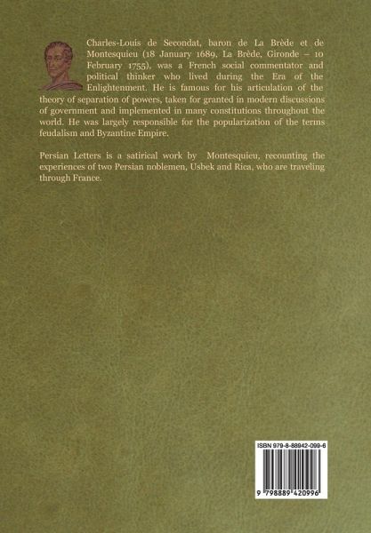 Persian Letters is a satirical work by Charles de Secondat, baron de Montesquieu, recounting the experiences of two Persian noblemen, Usbek and Rica, who are traveling through France. In 1711 Usbek leaves his seraglio in Isfahan to undertake the long journey to France, accompanied by his young friend Rica. He leaves behind five wives (Zachi, Zéphis, Fatmé, Zélis, and Roxane) in the care of a number of black eunuchs, one of whom is the head or first eunuch. During the trip and their long stay in Paris (1712-1720), they comment, in letters exchanged with friends and mullahs, on numerous aspects of Western, Christian society, particularly French politics and mores, ending with a biting satire of the System of John Law. Over time, various disorders surface back in the seraglio, and beginning in 1717 (Letter 139 [147]), the situation there rapidly unravels. Usbek orders his head eunuch to crack down, but his message does not arrive in time and a revolt brings about the death of his wives, including the vengeful suicide of his favorite, Roxane, and, it appears, most of the eunuchs... About the author: Charles-Louis de Secondat, baron de La Brède et de Montesquieu (18 January 1689, La Brède, Gironde - 10 February 1755), was a French social commentator and political thinker who lived during the Era of the Enlightenment. He is famous for his articulation of the theory of separation of powers, taken for granted in modern discussions of government and implemented in many constitutions throughout the world. He was largely responsible for the popularization of the terms feudalism and Byzantine Empire. Persian Letters is a satirical work by Montesquieu, recounting the experiences of two Persian noblemen, Usbek and Rica, who are traveling through France.