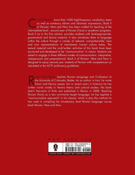 Containing over 1000 high-frequency vocabulary items as well as numerous idioms and idiomatic expressions, Book II has been crafted for teaching at the intermediate level -- second year of Persian (Farsi) in academic programs. Book II as in the first volume, provides students with level-appropriate, grammatical and lexical material. It also introduces them to language within the culture through a variety of relevant, comprehensible, here and now representations of mainstream Iranian culture today. The textual material and the oral/written activities of this book have been structured and developed to be "communicative" in nature. Students are asked to engage in three different modes of communication: interpretative, interpersonal and presentational. The book is designed to equip second year students of Persian with competencies as stipulated in the ACTF proficiency guidelines.