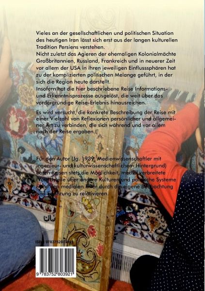 Vieles an der gesellschaftlichen und politischen Situation des heutigen Iran lässt sich erst aus der langen kulturellen Tradition Persiens verstehen. Nicht zuletzt das Agieren der ehemaligen Kolonialmächte Großbritannien, Russland, Frankreich und in neuerer Zeit vor allem der USA in ihren jeweiligen Einflusssphären hat zu der komplizierten politischen Melange geführt, in der sich die Region heute darstellt.Insofern hat die hier beschriebene Reise Informations- und Erkenntnisprozesse ausgelöst, die weit über das vordergründige Reise-Erlebnis hinausreichen.Es wird versucht, die konkrete Beschreibung der Reise mit einer Vielzahl von Reflexionen persönlicher und allgemeiner Art zu verbinden, die sich während und vor allem nach der Reise ergaben.