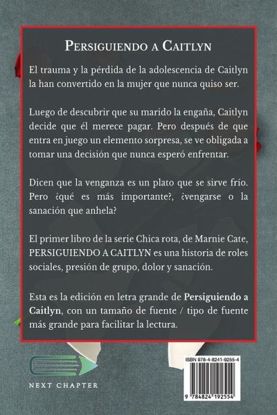 El trauma y la pérdida de la adolescencia de Caitlyn la han convertido en la mujer que nunca quiso ser. Luego de descubrir que su marido la engaña, Caitlyn decide que él merece pagar. Pero después de que entra en juego un elemento sorpresa, se ve obligada a tomar una decisión que nunca esperó enfrentar. Dicen que la venganza es un plato que se sirve frío. Pero ¿qué es más importante?, ¿vengarse o la sanación que anhela? El primer libro de la serie Chica rota, de Marnie Cate, PERSIGUIENDO A CAITLYN es una historia de roles sociales, presión de grupo, dolor y sanación. Esta es la edición en letra grande de Persiguiendo a Caitlyn, con un tamaño de fuente / tipo de fuente más grande para facilitar la lectura.
