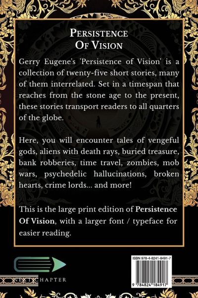 Gerry Eugene's 'Persistence of Vision' is a collection of twenty-five short stories, many of them interrelated. Set in a timespan that reaches from the stone age to the present, these stories transport readers to all quarters of the globe. Here, you will encounter tales of vengeful gods, aliens with death rays, buried treasure, bank robberies, time travel, zombies, mob wars, psychedelic hallucinations, broken hearts, crime lords... and more! This is the large print edition of Persistence Of Vision, with a larger font / typeface for easier reading.