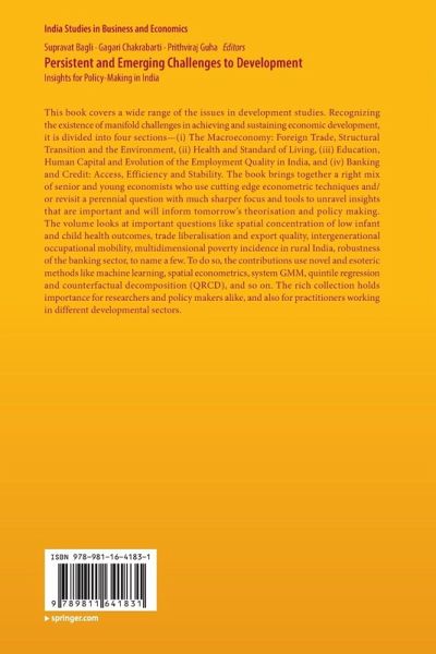 This book covers a wide range of the issues in development studies. Recognizing the existence of manifold challenges in achieving and sustaining economic development, it is divided into four sections-(i) The Macroeconomy: Foreign Trade, Structural Transition and the Environment, (ii) Health and Standard of Living, (iii) Education, Human Capital and Evolution of the Employment Quality in India, and (iv) Banking and Credit: Access, Efficiency and Stability. The book brings together a right mix of senior and young economists who use cutting edge econometric techniques and/ or revisit a perennial question with much sharper focus and tools to unravel insights that are important and will inform tomorrow's theorisation and policy making. The volume looks at important questions like spatial concentration of low infant and child health outcomes, trade liberalisation and export quality, intergenerational occupational mobility, multidimensional poverty incidence in rural India, robustness of the banking sector, to name a few. To do so, the contributions use novel and esoteric methods like machine learning, spatial econometrics, system GMM, quintile regression and counterfactual decomposition (QRCD), and so on. The rich collection holds importance for researchers and policy makers alike, and also for practitioners working in different developmental sectors..