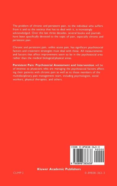 Chronic and persistent pain, which is a problem for the individual who suffers and the society that has to deal with it, has become increasingly appreciated. Over the last three decades, several books and journals have been specifically devoted to the topic of pain, especially chronic and persistent pain. It has been increasingly recognized that chronic and persistent pain, unlike acute pain, involves significant psychosocial factors and requires treatment strategies that deal with these issues. All measurements and factors that affect improvement seem to be in the psychosocial area rather than the medical/ biological/physical areas. Psychosocial conveys the importance of the environmental and interpersonal factors of the patient's functioning. The writing of this book has brought together some of the leading researchers and clinicians in the area of managing the patient with chronic pain. The authors express their opinions based on experience and review of the literature available to date. Each of the chapters focuses on an important element of the assessment and/or treatment intervention utilized for the individual with chronic pain. The concluding chapter summarizes the status of the assessment and treatment strategies for those patients.