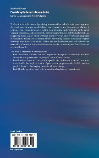 The book revisits the causes of persisting under nutrition in India, but moves away from the usual focus on women and children to a broader view of the entire population. It estimates the economic losses resulting from ignoring under nutrition in the adult working population and questions the current narrow focus of nutrition interventions, suggesting that a family-based approach may provide quicker results and long-term sustainability. It compares the best and worst performing states in the country to glean learnings from both successes and failures and emphasizes the need to hand over the ownership of nutrition outcomes from the state to the community and family for more sustainable results. The book is organized in three sections: Part 1 details the nutrition status of the population, regional variations in nutrition outcomes and government response in terms of interventions. Part 2 reviews issues and concerns like gender discrimination, poor child nutrition status, ineffective implementation of government programmes in the field and the possible impacts of emerging issues like climate change. Part 3 seeks solutions from both international and country experiences.