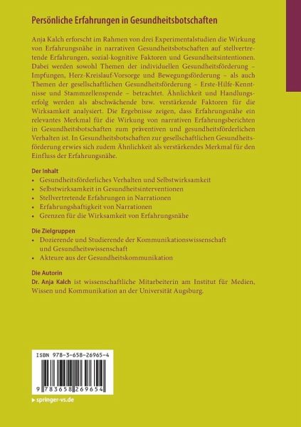 Anja Kalch erforscht im Rahmen von drei Experimentalstudien die Wirkung von Erfahrungsnähe in narrativen Gesundheitsbotschaften auf stellvertretende Erfahrungen, sozial-kognitive Faktoren und Gesundheitsintentionen. Dabei werden sowohl Themen der individuellen Gesundheitsförderung - Impfungen, Herz-Kreislauf-Vorsorge und Bewegungsförderung - als auch Themen der gesellschaftlichen Gesundheitsförderung - Erste-Hilfe-Kenntnisse und Stammzellenspende- betrachtet. Ähnlichkeit und Handlungserfolg werden als abschwächende bzw. verstärkende Faktoren für die Wirksamkeit analysiert. Die Ergebnisse zeigen, dass Erfahrungsnähe ein relevantes Merkmal für die Wirkung von narrativen Erfahrungsberichten in Gesundheitsbotschaften zum präventiven und gesundheitsförderlichen Verhalten ist. In Gesundheitsbotschaften zur gesellschaftlichen Gesundheitsförderung erwies sich zudem Ähnlichkeit als verstärkendes Merkmal für den Einfluss der Erfahrungsnähe.