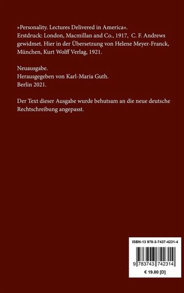 Rabindranath Tagore: Persönlichkeit. Vorlesungen über Erziehung, Meditation, Wiedergeburt, Kunst, Frauen und Persönlichkeit»Personality. Lectures Delivered in America«. Erstdruck: London, Macmillan and Co., 1917, C. F. Andrews gewidmet. Hier in der Übersetzung von Helene Meyer-Franck, München, Kurt Wolff Verlag, 1921.Neuausgabe, herausgegeben von Karl-Maria Guth, Berlin 2023.Der Text dieser Ausgabe wurde behutsam an die neue deutsche Rechtschreibung angepasst.Umschlagabbildung: Rabindranath Tagore in Kalkutta, 1909Gesetzt aus der Minion Pro, 11 pt.Die Sammlung Hofenberg erscheint im Verlag Henricus - Edition Deutsche Klassik GmbH, Berlin