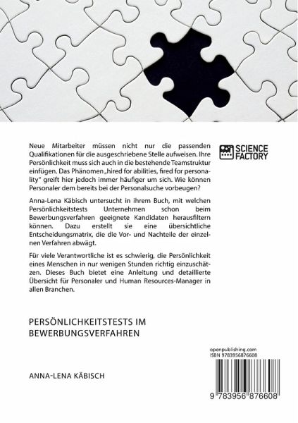 Neue Mitarbeiter müssen nicht nur die passenden Qualifikationen für die ausgeschriebene Stelle aufweisen. Ihre Persönlichkeit muss sich auch in die bestehende Teamstruktur einfügen. Das Phänomen "hired for abilities, fired for personality" greift hier jedoch immer häufiger um sich. Wie können Personaler dem bereits bei der Personalsuche vorbeugen?Anna-Lena Käbisch untersucht in ihrem Buch, mit welchen Persönlichkeitstests Unternehmen schon beim Bewerbungsverfahren geeignete Kandidaten herausfiltern können. Dazu erstellt sie eine übersichtliche Entscheidungsmatrix, die die Vor- und Nachteile der einzelnen Verfahren abwägt.Für viele Verantwortliche ist es schwierig, die Persönlichkeit eines Menschen in nur wenigen Stunden richtig einzuschätzen. Dieses Buch bietet eine Anleitung und detaillierte Übersicht für Personaler und Human Resources-Manager in allen Branchen.Aus dem Inhalt:- War of Talents;- Personalmanagement;- Persönlichkeitstest;- Assessment Center;- Crunch Time