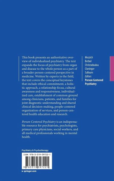 This book presents an authoritative overview of the emerging field of person-centered psychiatry. This perspective, articulating science and humanism, arose within the World Psychiatric Association and aims to shift the focus of psychiatry from organ and disease to the whole person within their individual context. It is part of a broader person-centered perspective in medicine that is being advanced by the International College of Person-Centered Medicine through the annual Geneva Conferences held since 2008 in collaboration with the World Medical Association, the World Health Organization, the International Council of Nurses, the International Federation of Social Workers, and the International Alliance of Patients' Organizations, among 30 other international health institutions. In this book, experts in the field cover all aspects of person-centered psychiatry, the conceptual keystones of which include ethical commitment; a holistic approach; a relationship focus; cultural sensitivity; individualized care; establishment of common ground among clinicians, patients, and families for joint diagnostic understanding and shared clinical decision-making; people-centered organization of services; and person-centered health education and research.