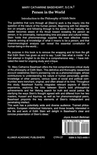 `Sr. Mary Catherine Baseheart offers the first comprehensive critical study of the philosophy of Edith Stein. This definitive and thoroughly researched account establishes Stein's pioneering role as a phenomenologist, whose contributions to understanding the nature of human personality, gender, knowledge of other persons, various types of social and political communities were trenchant, original, and often ahead of its time. Throughout this study, Baseheart fluently integrates relevant aspects of Stein's experience, exploring the links between Stein's bold philosophical achievements and her lifelong search for truth and social justice. By clarifying the ways Stein's thought agreed with and differed from her two masters, Husserl and Aquinas, as well as her phenomenological peers, Baseheart pinpoints the key elements of Stein's independent and penetrating intellect.