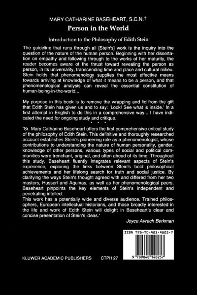 `Sr. Mary Catherine Baseheart offers the first comprehensive critical study of the philosophy of Edith Stein. This definitive and thoroughly researched account establishes Stein's pioneering role as a phenomenologist, whose contributions to understanding the nature of human personality, gender, knowledge of other persons, various types of social and political communities were trenchant, original, and often ahead of its time. Throughout this study, Baseheart fluently integrates relevant aspects of Stein's experience, exploring the links between Stein's bold philosophical achievements and her lifelong search for truth and social justice. By clarifying the ways Stein's thought agreed with and differed from her two masters, Husserl and Aquinas, as well as her phenomenological peers, Baseheart pinpoints the key elements of Stein's independent and penetrating intellect.