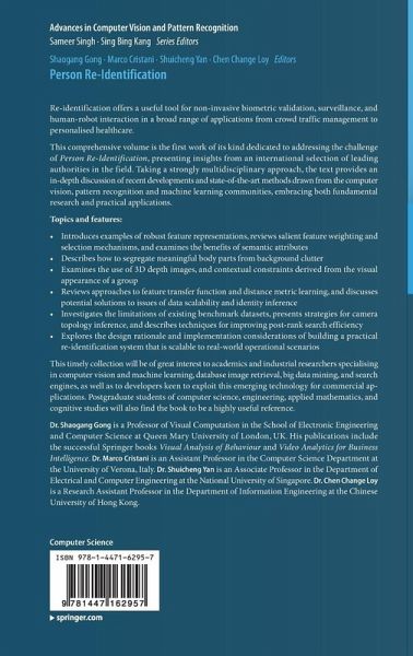 The first book of its kind dedicated to the challenge of person re-identification, this text provides an in-depth, multidisciplinary discussion of recent developments and state-of-the-art methods. Features: introduces examples of robust feature representations, reviews salient feature weighting and selection mechanisms and examines the benefits of semantic attributes; describes how to segregate meaningful body parts from background clutter; examines the use of 3D depth images and contextual constraints derived from the visual appearance of a group; reviews approaches to feature transfer function and distance metric learning and discusses potential solutions to issues of data scalability and identity inference; investigates the limitations of existing benchmark datasets, presents strategies for camera topology inference and describes techniques for improving post-rank search efficiency; explores the design rationale and implementation considerations of building a practical re-identification system.
