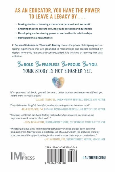 As an educator, you have the power to leave a legacy by . . . Making students’ learning experiences personal and authentic Ensuring that the culture around you is personal and authentic Developing and nurturing personal and authentic relationships Being personal and authentic In Personal & Authentic, Thomas C. Murray reveals the power of designing awe-inspiring experiences that are grounded in relationships and learner-centered by design. Inherently relevant and contextualized, it is this kind of learning that lasts a lifetime. Be bold. Be fearless. Be proud. Be you. Your story is not finished yet. "After you read this book, you will become a better teacher and leader—and if not, you might want to read it again!" —Salome Thomas-EL, award-winning principal, speaker, and author "One of the most helpful, heartfelt, and unassuming stories I’ve ever read." —Brad Gustafson, EdD, national distinguished principal and best-selling author "The story always wins. The most impactful learning has always been personal and authentic. Murray does a masterful job of weaving both the gripping story of educators and the opportunities for them to increase their impact on students." —Joe Sanfelippo, PhD, superintendent, author, and speaker "Teachers will finish this book feeling inspired and empowered to continue the important work we are called to do." —Luisa Palomo Hare, kindergarten teacher, 2012 Nebraska Teacher of the Year