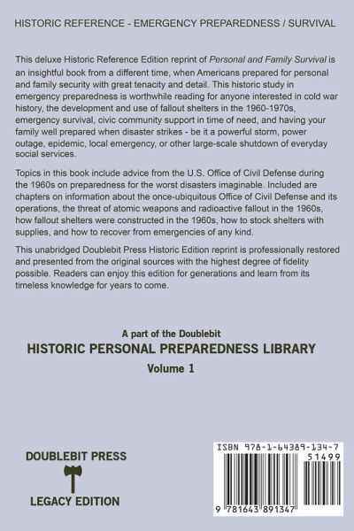 A Vintage Manual for Historic Study of Cold-War-Era Family and Personal Survival and Shelter Preparation This deluxe, unabridged reprint Historic Reference Edition of the U.S. Office of Civil Defense 1966 manual Personal and Family Survival recounts a bygone time when Americans prepared for personal and family security. This historic study in emergency preparedness is worthwhile reading for anyone interested in cold-war history, the development and use of fallout shelters in the 1960-1970s, emergency survival, and having your family well prepared for when disaster strikes, be it a powerful storm, epidemic, local emergency, or other large-scale shutdown of daily economic operations. Topics in the book include advice from the U.S. Federal Government during the 1960s on preparedness for the worst disasters. Included are chapters on information about the once-ubiquitous U.S. Office of Civil Defense and its purpose and operations, the threat of atomic weapons and radioactive fallout from the 1960s, how fallout shelters were constructed in the 1960s and how they were stocked with supplies, information about public fallout shelters of the day, how to prepare for fallout protection at the home and the farm, how to stock supplies for family and community emergency response, and how to recover from emergencies common to the 1960s, including weather-related disasters and nuclear weapons use. This book makes a good gift for historic study for people interested in the cold-war history or old techniques and approaches for family and personal preparedness for emergencies from a bygone era. Although much of the information in this manual is outdated for the current day, some of its information may be useful for preparing for local disasters and keeping prepped for whatever comes your way. A part of the Doublebit Historic Personal Preparedness Library: Volume 1 This Doublebit Historic Reference Edition reprint of Personal and Family Survival is professionally restored and presented from the original source with the highest degree of fidelity possible, including inspiration from the original first-edition cover. Available in both paperback and hardcover, readers can enjoy this Historic Reference Edition for generations and learn from its timeless knowledge for years to come. About the Doublebit Press Library of Historic Reference Edition Reprints Sometimes we need to remember our history to move forward. Sometimes, remembering our heritage is just fun or inspirational. With technology playing a major role in everyday life, sometimes we need to take a step back in time to find those basic building blocks used for gaining mastery - the things that we have luckily not completely lost and has been recorded in books over the last two centuries. These skills aren't forgotten, they've just been shelved. It's time to unshelve them once again and reclaim the lost knowledge of self-sufficiency! As a part of the Doublebit Historic Reference Edition reprints collection, this unabridged volume is reprinted in the exact form as it was presented in the original publication. Both important and minor details have equally both been accounted for by our publishing staff, down to the cover, font, layout, and images. It is the goal of Doublebit Historic Reference Edition series to preserve outdoors heritage, but also be cherished as collectible pieces, worthy of collection in any outdoorsperson's library and that can be passed to future generations.