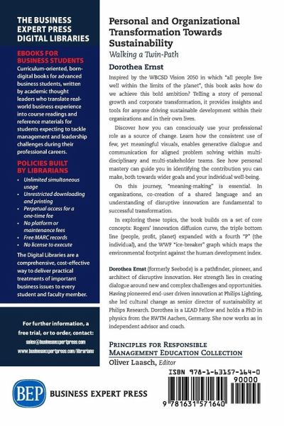Inspired by the WBCSD Vision 2050 in which "all people live well within the limits of the planet", this book asks how do we achieve this bold ambition? Telling a story of personal growth and corporate transformation, it provides insights and tools for anyone driving sustainable development within their organizations and in their own lives. Discover how you can consciously use your professional role as a source of change. Learn how the consistent use of few, yet meaningful visuals, enables generative dialogue and communication for aligned problem solving within multi-disciplinary and multi-stakeholder teams. See how personal mastery can guide you in identifying the contribution you can make, both towards wider goals and your individual well-being. On this journey, "meaning-making" is essential. In organizations, co-creation of a shared language and an understanding of disruptive innovation are fundamental to successful transformation. In exploring these topics, the book builds on a set of core concepts: Rogers' innovation diffusion curve, the triple bottom line (people, profit, planet) expanded with a fourth "P" (the individual), and the WWF "ice-breaker" graph which maps the environmental footprint against the human development index.
