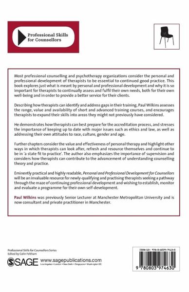 `Conveys valuable information... Paul Wilkins writes well... With the current emphasis by accrediting counselling organizations on the importance of ongoing personal and professional development, this book would be a salutary place to start on such a journey... The book explores what is meant by "fit to practise" and highlights the need to provide a better service to those who seek the skills of a counsellor. With the increasing emphasis on the need for better praxis in the field, it is vital that counsellors practise what they preach. If they fail to pay attention to their own ongoing well-being, they should not be surprised if the therapy they offer to others is seen to be marred by the shadow of hypocrisy' - Counselling, The Journal of the British Association for Counselling `A helpful guide for newly qualified counsellors. It gives some comprehensive ideas and tips for further development... a useful book' - Self & Society `Thought-provoking and enhanced by questions scattered throughout the text, this book covers areas of training, accreditation, personal therapy, supervision, contribution to knowledge, creative writing, personal journal work, portfolios, dreamwork, self-resourcing and development on a budget. Well-paced and presented in a clear, practical and authoritative way, this book offers information and guidance... Each chapter is well structured... Highlighted boxes contain valuable information... Quotations add to the richness of the text... this book has helped me to question my developmental needs and I certainly intend following up some of its ideas and suggestions' - Counselling News