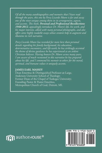 Of all the many autobiographies and memoirs that I have read through the years, this one by Percy Licardo Moore is far and away one of the most unique among them in its arrangement, aspects, and accents. This book, Personal and Professional Recollections 1940-2012, appealingly introduces Dr. Moore's life, his work, and his major interests, allied with many personal photographs, and also offers some highly readable essays whose content help to augment and illumine its rich narrative. Percy Licardo Moore has recorded far more here than personal details regarding his family background, his education, determinative encounters, and life-work; he has strikingly accented the theme of divine guidance he has experienced as an ardent Christian believer. Having known Dr. Moore across many years, I am aware of much recounted in this narrative he has prepared about his life, and I commend his memoir to others for the moral, spiritual, and humane values it uniquely accents. JAMES EARL MASSEY Dean Emeritus & Distinguished Professor-at-Large, Anderson University School of Theology; Former Dean of the Chapel of Tuskegee University; Founding Pastor & Pastor Emeritus, Metropolitan Church of God, Detroit, MI.
