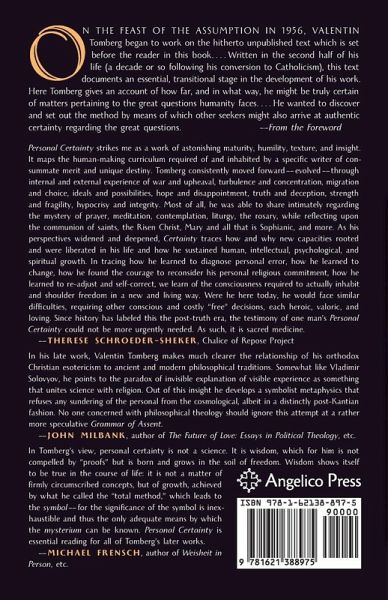 On the Feast of the Assumption in 1956, Valentin Tomberg began to work on the hitherto unpublished text which is set before the reader in this book. Written in the second half of his life (a decade or so following his conversion to Catholicism), this text documents an essential, transitional stage in the development of his work. Here Tomberg gives an account of how far, and in what way, he might be truly certain of matters pertaining to the great questions humanity faces. He wanted to discover and set out the method by means of which other seekers might also arrive at authentic certainty regarding the great questions. Personal Certainty strikes me as a work of astonishing maturity, humility, texture, and insight. It maps the human-making curriculum required of and inhabited by a specific writer of consummate merit and unique destiny. Tomberg consistently moved forward-evolved-through internal and external experience of war and upheaval, turbulence and concentration, migration and choice, ideals and possibilities, hope and disappointment, truth and deception, strength and fragility, hypocrisy and integrity. Most of all, he was able to share intimately regarding the mystery of prayer, meditation, contemplation, liturgy, the rosary, while reflecting upon the communion of saints, the Risen Christ, Mary and all that is Sophianic, and more. As his perspectives widened and deepened, Certainty traces how and why new capacities rooted and were liberated in his life and how he sustained human, intellectual, psychological, and spiritual growth. In tracing how he learned to diagnose personal error, how he learned to change, how he found the courage to reconsider his personal religious commitment, how he learned to re-adjust and self-correct, we learn of the consciousness required to actually inhabit and shoulder freedom in a new and living way. Were he here today, he would face similar difficulties, requiring other conscious and costly "free" decisions, each heroic, valoric, and loving. Since history has labeled this the post-truth era, the testimony of one man's Personal Certainty could not be more urgently needed. As such, it is sacred medicine. -Therese Schroeder-Sheker, Chalice of Repose Project In his late work, Valentin Tomberg makes much clearer the relationship of his orthodox Christian esotericism to ancient and modern philosophical traditions. Somewhat like Vladimir Solovyov, he points to the paradox of invisible explanation of visible experience as something that unites science with religion. Out of this insight he develops a symbolist metaphysics that refuses any sundering of the personal from the cosmological, albeit in a distinctly post-Kantian fashion. No one concerned with philosophical theology should ignore this attempt at a rather more speculative Grammar of Assent-John Milbank, author of The Future of Love: Essays in Political Theology, etc. In Tomberg's view, personal certainty is not a science. It is wisdom, which for him is not compelled by "proofs" but is born and grows in the soil of freedom. Wisdom shows itself to be true in the course of life: it is not a matter of firmly circumscribed concepts, but of growth, achieved by what he called the "total method," which leads to the symbol. We find this emphasis on the symbol vastly expanded in the author's later, magisterial Meditations on the Tarot, now considered one of the classic spiritual texts of the twentieth century.-Michael Frensch, author of Weisheit in Person