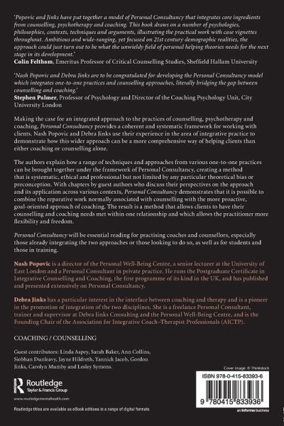 Making the case for an integrated approach to the practices of counselling, psychotherapy and coaching, Personal Consultancy provides a coherent and systematic framework for working with clients. Nash Popovic and Debra Jinks use their experience in the area of integrative practice to demonstrate how this wider approach can be a more comprehensive way of helping clients than coaching or counselling on its own.
