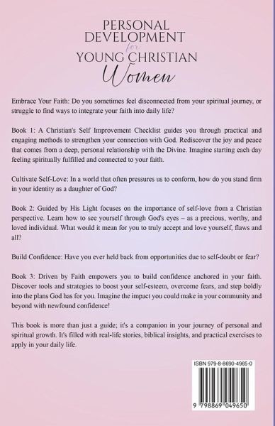 Are you a young Christian woman seeking to deepen your faith while also nurturing your personal growth? "Personal Development for Young Christian Women" is a unique 3-in-1 guide designed specifically for you. This transformative book bridges the gap between spiritual enrichment and personal development, offering a holistic approach to embracing your faith, cultivating self-love, and building confidence. Embrace Your Faith: Do you sometimes feel disconnected from your spiritual journey, or struggle to find ways to integrate your faith into daily life? ¿¿¿¿Book 1: A Christian's Self Improvement Checklist guides you through practical and engaging methods to strengthen your connection with God. Rediscover the joy and peace that comes from a deep, personal relationship with the Divine. Imagine starting each day feeling spiritually fulfilled and connected to your faith. Cultivate Self-Love: In a world that often pressures us to conform, how do you stand firm in your identity as a daughter of God? ¿¿¿¿Book 2: Guided by His Light focuses on the importance of self-love from a Christian perspective. Learn how to see yourself through God's eyes - as a precious, worthy, and loved individual. What would it mean for you to truly accept and love yourself, flaws and all? Build Confidence: Have you ever held back from opportunities due to self-doubt or fear? ¿¿¿¿Book 3: Driven by Faith empowers you to build confidence anchored in your faith. Discover tools and strategies to boost your self-esteem, overcome fears, and step boldly into the plans God has for you. Imagine the impact you could make in your community and beyond with newfound confidence! This book is more than just a guide; it's a companion in your journey of personal and spiritual growth. It's filled with real-life stories, biblical insights, and practical exercises to apply in your daily life. Ask Yourself:Are you ready to transform your relationship with God and yourself? How would your life change if you fully embraced your identity as a Christian woman? What dreams could you achieve with greater self-love and confidence? Embrace this opportunity to grow in faith, love, and confidence. Your journey to a more fulfilled life starts here. Take the first step today. Add this empowering guide to your cart and embark on a transformative journey of faith and personal growth.