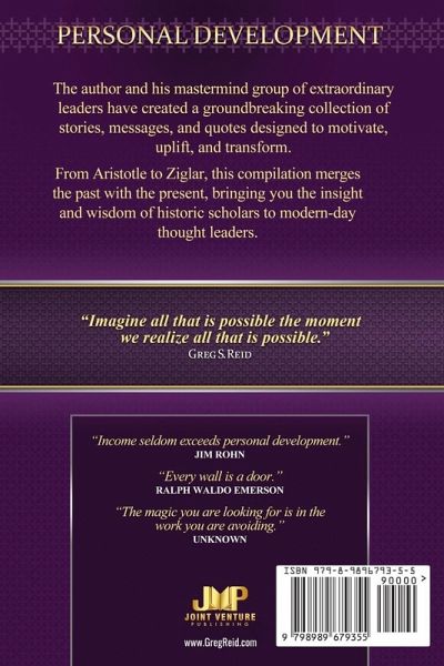 "Imagine all that is possible the moment we realize all that is possible." - Greg S. Reid Personal Development redefines self-help and brings it into the 21st century ... and beyond! The author and his mastermind group of extraordinary leaders have created a groundbreaking collection of stories, messages, and quotes designed to motivate, uplift, and transform. From Aristotle to Ziglar, this compilation merges the past with the present, bringing you the insight and wisdom of historic scholars and modern-day thought leaders. Whether you prefer to digest its fresh, storied content topic by topic or from cover to cover, these time-tested principles are the ideal answer for anyone who has ever asked, "How can I get more out of life?" Discover the answer with this compilation of quotes and insights by the author, iconic leaders, and the phenomenal Personal Development mastermind group, consisting of: Maris Segal, Ken Ashby, Kohila Sivasothy, Doug Fisher, Jan McGregor, Sloan Reid, Brayand Ponciano, Ana Melikian, Mark Willes, Keith Hale, Victoria Rader, and Kelly Cardenas.