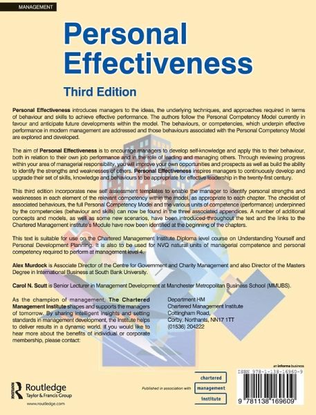 'Personal Effectiveness' encourages managers to develop self-knowledge and apply this to their behaviour, both in relation to their own job performance and in the role of leading and managing others. Through reviewing progress within your area of managerial responsibility, you will improve your own opportunities and prospects as well as build the ability to identify the strengths and weaknesses of others. "Personal Effectiveness" inspires managers to continuously develop and upgrade their set of skills, knowledge and behaviours to be appropriate for effective leadership in the 21st century. 'Personal Effectiveness' introduces managers to the idea of effective performance and the underlying techniques and approaches required in terms of behaviour and skills to achieve effective performance. The authors follow the Personal Competency Model currently in favour and anticipate future developments within the model. The behaviours, or competencies, which underpin effective performance in modern management are addressed and those behaviours associated with the Personal Competency Model are explored and developed.This third edition of Personal Effectiveness incorporates new self-assessment templates to enable the manager to identify personal strengths and weaknesses in each element of the relevant competency within the model, as appropriate to each chapter. The checklist of associated behaviours, the full Personal Competency Model and the various units of competence (performance) underpinned by the competencies (behaviour and skills) can now be found in the three associated appendices. A number of additional concepts and models, as well as some new scenarios, have been introduced throughout the text and the links to the Institute"s Module (where relevant) have now been identified at the beginning of the chapters.The text is suitable for use on the Chartered Management Institutes Diploma Level course on Understanding Yourself and "Personal Development Planning". It is also suitable for NVQ national units of managerial competence and personal competency required to perform at management level 4.