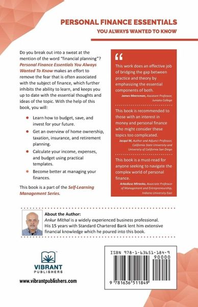 A Practical Guide to Budgeting, Investing, Retirement Planning, Home Ownership, and Taxation. An introduction to managing your personal finances better Personal Finance Essentials You Always Wanted to Know is a guide that will help you understand money and manage it like a pro. Do you break out into a sweat at the mention of the word 'financial planning?' Do you often struggle with meeting your expenses? Do you worry about the future and ensuring your financial stability? And is the time for filing tax returns stressful for you? Countless others go through the same experience, but it need not be this way. This book answers all your pressing questions about finance and many more. It makes an effort to remove the fear that is often associated with the subject of finance by offering all the essentials in a conversational manner to engage the readers. Packed with fun facts and quizzes, it tackles subjects that constitute the world of personal finance which everyone has to deal with, whether we like it or not. With the help of this book, you will:Learn how to budget, save, and invest for your future. Get an overview of home ownership, taxation, insurance, and retirement planning. Calculate your income, expenses, and budget using practical templates. Become better at managing your finances. Personal Finance Essentials is a ready reckoner for individuals who would like to know more but do not know where to start. It could be you and me, or students beginning a course in Finance, or youngsters exploring different lines of education and career. It could also be an organization attempting to help employees understand money management. This book has something for everyone. It is a part of the Self-Learning Management Series designed to help students, managers, career switchers, and entrepreneurs learn essential management lessons.
