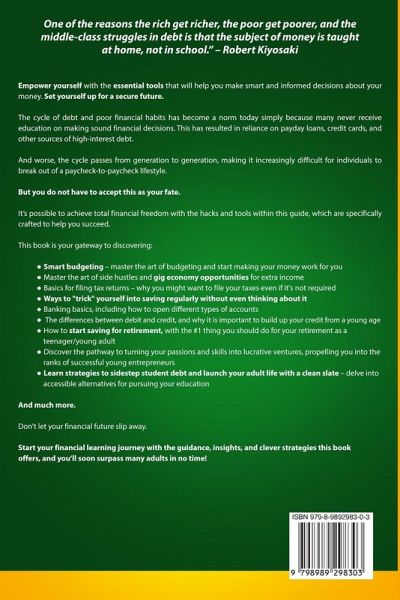 Personal Finance for Teens and Young Adults: Financial Literacy Skills to Empower Your Future, Crush Your Debt & Build Smart Money Habits That Instill Lifelong Confidence" is a comprehensive guide tailored to help young individuals navigate the complex world of personal finance. This book is a must-read for teens and young adults eager to establish a solid financial foundation for their future. Starting with the basics, the book introduces fundamental money management concepts, including budgeting, saving, and responsible spending. It emphasizes the importance of financial literacy from a young age, demonstrating how early habits can shape one's financial future. The guide also explores more advanced topics like investing, insurance, banking, college loans, credit scores, and the wise use of credit cards, making it a valuable resource for those beginning their financial journey. It also comprehensively reviews job, internship, and entrepreneurial endeavors for teens and young adults. One of the critical features of this book is its focus on debt management, particularly addressing common concerns faced by young adults, such as student loans and credit card debt. It offers practical debt reduction and avoidance strategies, empowering readers with cutting-edge knowledge to make informed financial decisions. Beyond just technical financial advice, the book delves into the psychological aspects of money, teaching young adults how to develop a healthy relationship with their finances. It includes real-world scenarios and examples, making the content relatable and easily understood. Overall, this book is an invaluable tool for any young person looking to take charge of their financial well-being. It's a guide to managing money and an educational resource that builds the confidence and skills necessary for financial independence and success.