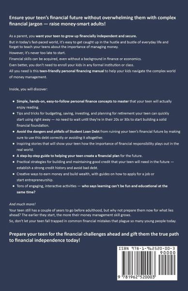 Ensure your teen's financial future without overwhelming them with complex financial jargon - raise money-smart adults! Are you worried about your teen's future financial stability knowing all too well that they don't have the needed financial skills to survive adulthood? Have you tried teaching them the basics of personal finance, only to be met with disinterest or confusion? Do you want to help them master personal finance but don't know where to start? If so, you're not alone. As a parent, you want your teen to grow up financially independent and secure. But in today's fast-paced world, it's easy to get caught up in the hustle and bustle of everyday life and forget to teach your teens about the importance of managing money. However, it's never too late to start. Financial skills can be acquired, even without a background in finance or economics. Even better, you don't need to enroll your kids in any formal institution or class. All you need is a reliable guide that will provide you with easy-to-understand insights and actionable steps to help your teen gain control of their financial future. And with this teen-friendly personal financing manual, your kids will discover all they need to navigate the complex world of money management. Inside, you will discover: Simple, hands-on, easy-to-follow personal finance concepts to master that your teen will actually enjoy reading - boring financial lessons no more! Tips and tricks for budgeting, saving, investing, and planning for retirement your teen can quickly start using right away - no need to wait until they're in their 20s or 30s to start building a solid financial foundation Avoid the dangers and pitfalls of Student Loan Debt from ruining your teen's financial future by making sure to use this debt correctly or avoiding it altogether. Inspiring stories that will show your teen how the importance of financial responsibility plays out in the real world A step-by-step guide to helping your teen create a financial plan for the future to ensure their financial independence Practical strategies for building and maintaining good credit that your teen will need in the future - discover ways to establish a strong credit history and avoid bad debt Creative ways to earn money and build wealth, with guides on how to apply for a job or start entrepreneurship Tons of engaging, interactive activities that will keep your teen interested and excited to know more about finances - who says learning can't be fun and educational at the same time? And much more! Your teen still has a couple of years to go before adulthood, but why not prepare them now for what lies ahead? The earlier they start, the more their money management skill grows. So, don't let your teen fall trapped in common financial mistakes that plague so many young people today. Gift them the true path to financial independence today!If you want to prepare your teen for the financial challenges ahead, then scroll up and click "Add to Cart" right now.